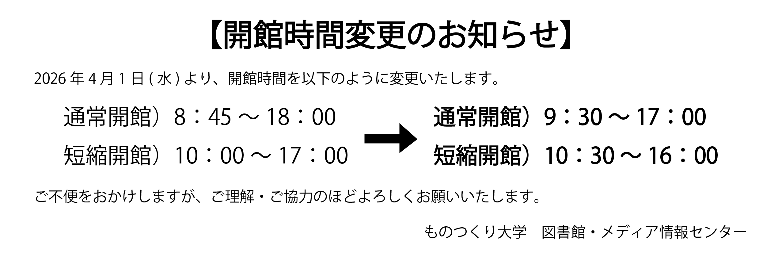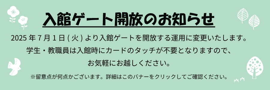 INFORMATION CALENDAR PICK UP 2026/02/16 開館時間変更のお知らせ 2026/02/12 展示コーナー:「ガウディ」 2026/02/03 春休みの休館日・利用時間短縮のお知らせ 2026/01/27 春の長期貸出を実施します NEWS 2026/02/16 開館時間変更のお知らせ 2026/02/12 展示コーナー:「ガウディ」 2026/02/03 春休みの休館日・利用時間短縮のお知らせ 2026/01/27 春の長期貸出を実施します 2025/12/02 年末年始の開館時間・休館のお知らせ 2025/12/02 冬の長期貸出を実施します。 2025/08/01 夏休みの休館日・利用時間短縮のお知らせ 2025/07/18 夏の長期貸出を実施します 2025/06/23 入館ゲート開放のお知らせ 2025/06/02 特別開館のお知らせ(6/22) 一覧をみる