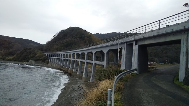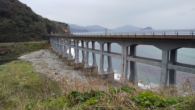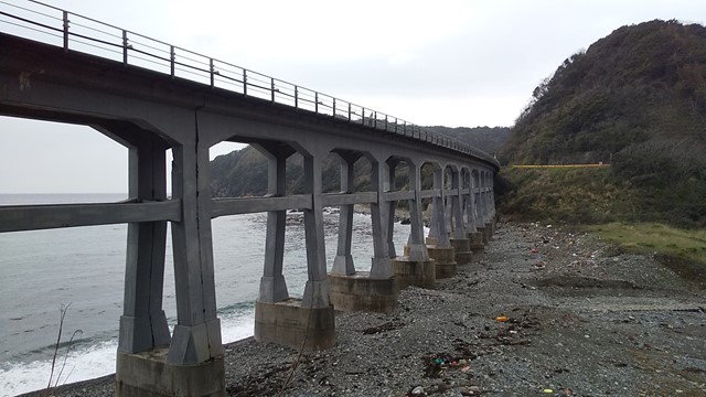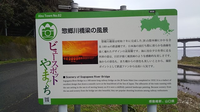 惣郷川(そうごうがわ)橋梁は,阿武町のJR西日本 山陰本線 須佐~宇田郷間の白須川(惣郷川)に架かる鉄道橋です.1932年に山陰本線最後の開通区間に完成しました.日本海に隣接し塩害を避けるため,鉄筋コンクリート4柱ラーメン構造の堅牢作りとなっており,波浪によって川底が洗掘される危険があるため,井筒基礎が用いられています.撮影スポットとして鉄道ファンの人気は高く,ラーメン高架橋の先駆け的な存在として,土木学会選奨土木遺産を受賞しています.