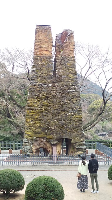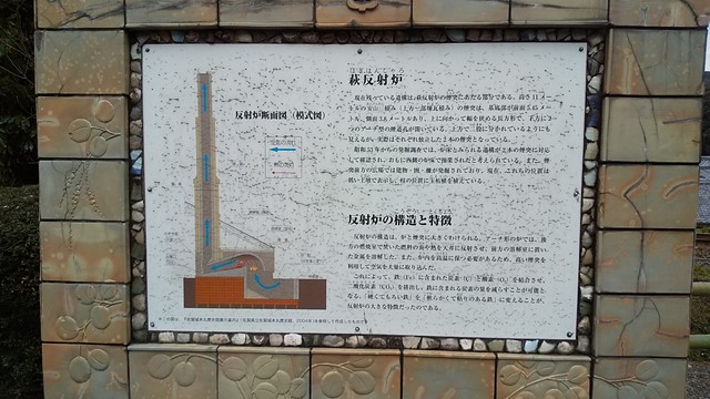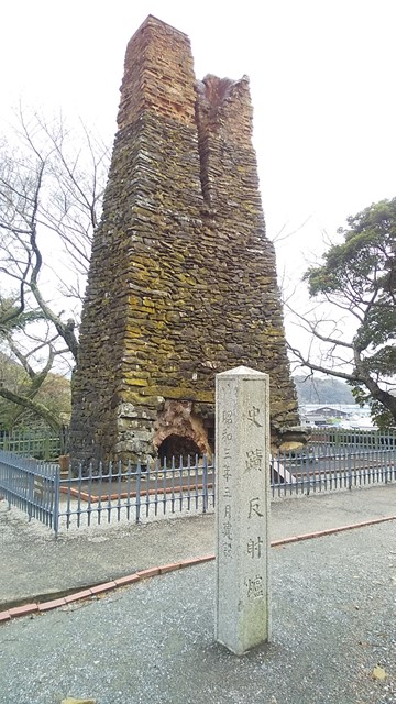 萩反射炉を見学しました.海防強化の一環として,西洋式の鉄製大砲鋳造を目指した萩藩が,1856年に試作的に築いた反射炉の遺跡です.当時は鉄製大砲を建造するには,衝撃に弱い硬い鉄を粘り気のある軟らかい鉄に溶解する必要があり,その装置として反射炉を用いていました.高さ10.5mの安山岩積み(上方一部レンガ積み)の煙突にあたる部分が残っています.反射炉の遺構が現存するのは,静岡県伊豆の国市の韮山反射炉と鹿児島市の旧集成館,萩市の3ヶ所のみです.