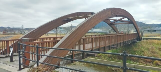 神興(じんごう)橋は,宗像市赤間の釣川に架かる2001年完成の木製アーチ橋です.下横桁や横構は鋼製ですが,アーチリブは木材を重ねて使用し,接合部に鋼材を用いています.