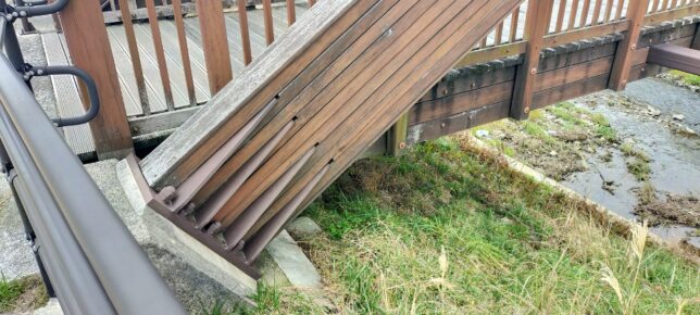 加茂ゆらりんこ橋 デッキ鋼板の樹脂舗装が痩せ馬に沿って取れており,腐食が心配です.