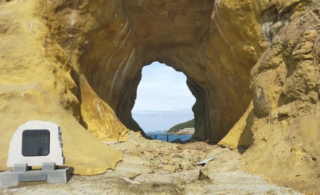 芦屋町の沖,手前の堂山と奥の洞山は2つの岩地が連なった島で,現在は地続きとなっており総称で洞山(どうやま)と呼ばれています.満潮時以外は歩いて渡ることができます.沖の洞山には高さ10m,幅12m,奥行30mの洞穴があります.この穴はその昔,神功皇后が戦に行く途中,必勝を誓って矢を射ると島を貫通し,その穴が大きくなり洞穴になったという伝説が残っています.