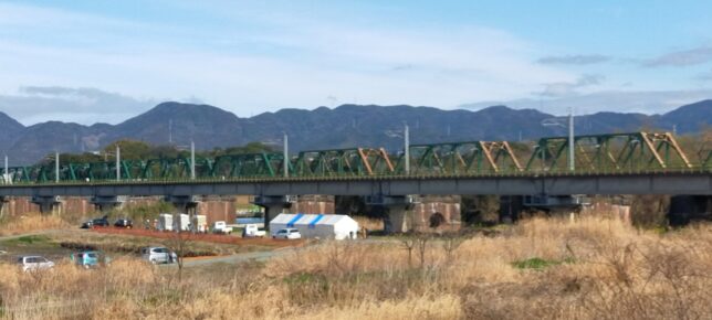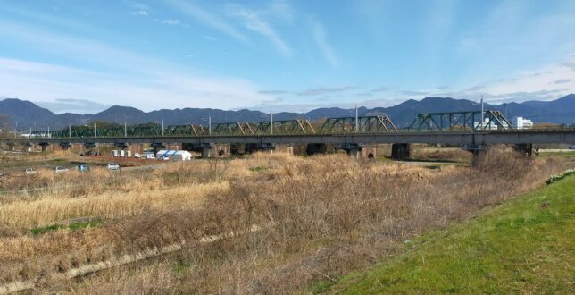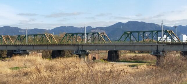 遠賀川(おんががわ)橋梁は,中間(なかま)市の遠賀川に架かるJR筑豊(ちくほう)本線 中間~筑前垣生(ちくぜんはぶ)間の鉄道橋です.現在 下り線として使用されているのが1923年竣工の橋長389m,支間長31.4mの単純下路プラットトラス12連となります.