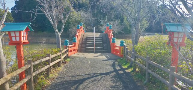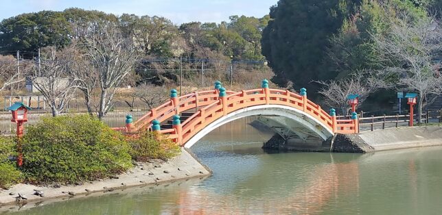 中間市の垣生公園は桜の名所として知られ,垣生池に架かる鉄筋コンクリートアーチの赤い延壽(えんじゅ)橋は,埴生神社へ続いています.