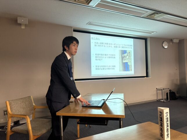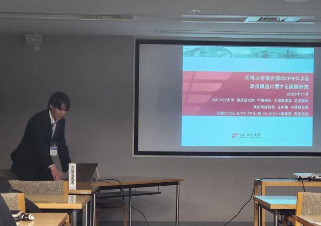 2025年11月26日 (水), 27日 (木)に建築会館において,第16回複合・合成構造の活用に関するシンポジウムが開催され,ものつくり大学 大垣研究室 大学院2年の平田桐也さん,小林駿さん,4年生の栗原良太朗さん,および日塔惟雲さんが発表しました.素晴らしい発表でした.このシンポジウム論文はアブストラクト審査であり,フルペーパーは約8ページです.その他,本学関連の発表含めて以下の9件になります.学生さんの発表状況の写真を掲載します.これらの活動を通じて,学生さんの成長を期待しています.