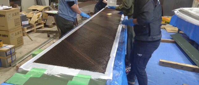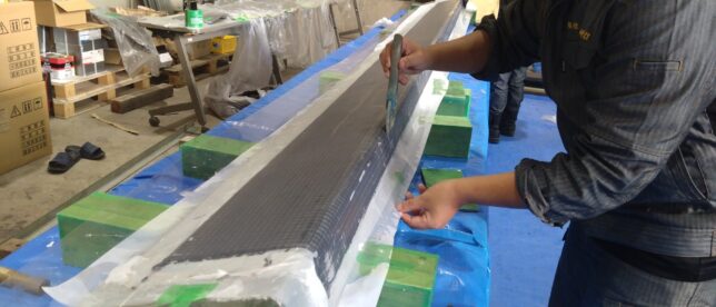 炭素繊維シートをハンドレイアップで積層して,CFRP成形材を学生さん自ら製作しています.繊維の配向は軸方向と±45度方向を交互に積層して,せん断伝達できる部材にしています.積層後に電気ノコで切断加工成形して,最終的に鋼部材に接着して載荷実験を行います.学生さんの慣れた手つきに少し感激しています.
