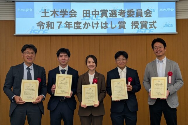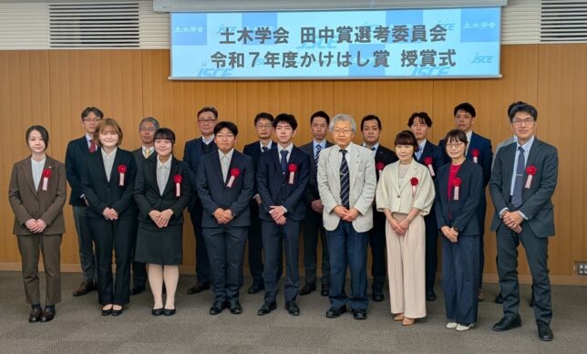 土木学会全国大会で講演された橋に関する社会性や将来性に優れた取組みに対して,田中賞選考委員会では「かけはし賞」を授与しています.昨年の 9 月に開催された土木学会の全国大会後に,エントリーされた43題の講演の中から,厳正な審査により6題に令和7年度「かけはし賞」が授与されました.令和8年3月24日に土木学会において表彰式がありました.