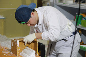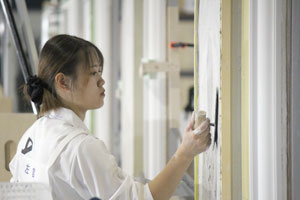 鏝と呼ばれる左官独特の道具を使い、壁を想定した下地に石こうや石灰を主材料とした塗り壁を造ります。また、石こう置引きの左官技法を用いて、モールディング作業を行います。特に接合部の美しさが評価されます。