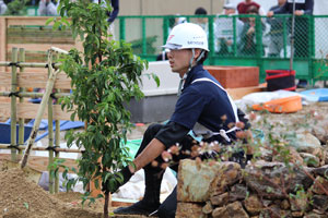 決められた区域内に石積みや石張り、木製ベンチ、池、木柵、植栽、芝生張りなどを行い、和風と洋風の造園技法を織り交ぜ、外構工事における総合的な造園技能の熟練度を競うものです。