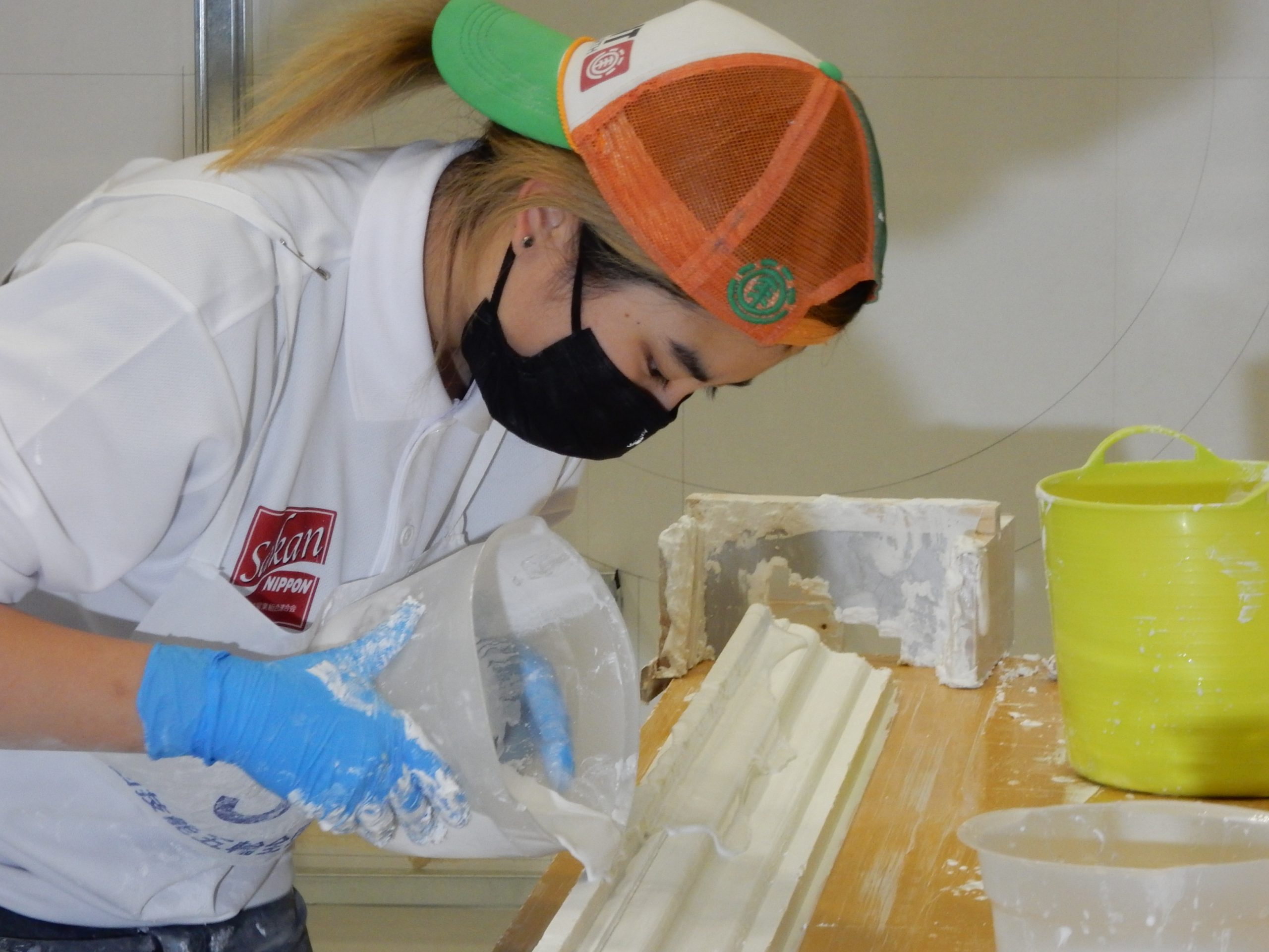 鏝と呼ばれる左官独特の道具を使い、壁を想定した下地に石こうや石灰を主材料とした塗り壁を造ります。また、石こう置引きの左官技法を用いて、モールディング作業を行います。特に接合部の美しさが評価されます。