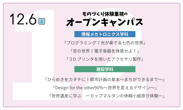 - 数学が苦手で理工系分野への進学を悩んでいる方に向けて、「ワークショップ」「コースの説明」「在学生フリートーク」を通して、工学の魅力をお伝えします。 当日は、文系出身の在学生とのフリートークもありますので、数学が苦手でもついていける?など、気軽に聞いてみてください。