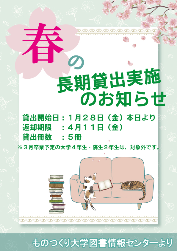 春の長期貸出を実施します。2022/01/28 春休みに伴い、長期貸出を実施いたします。 貸出開始日:1月28日(金)本日より 貸出期限 :4月11日(金) 貸出冊数 :5冊 ※3月卒業予定の大学4年生・院生2年生は、対象外です。