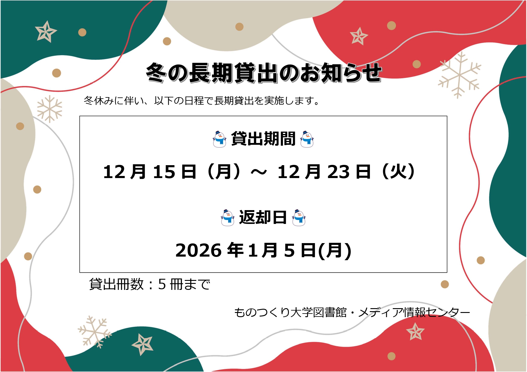 冬休みに伴い、長期貸出を実施します。