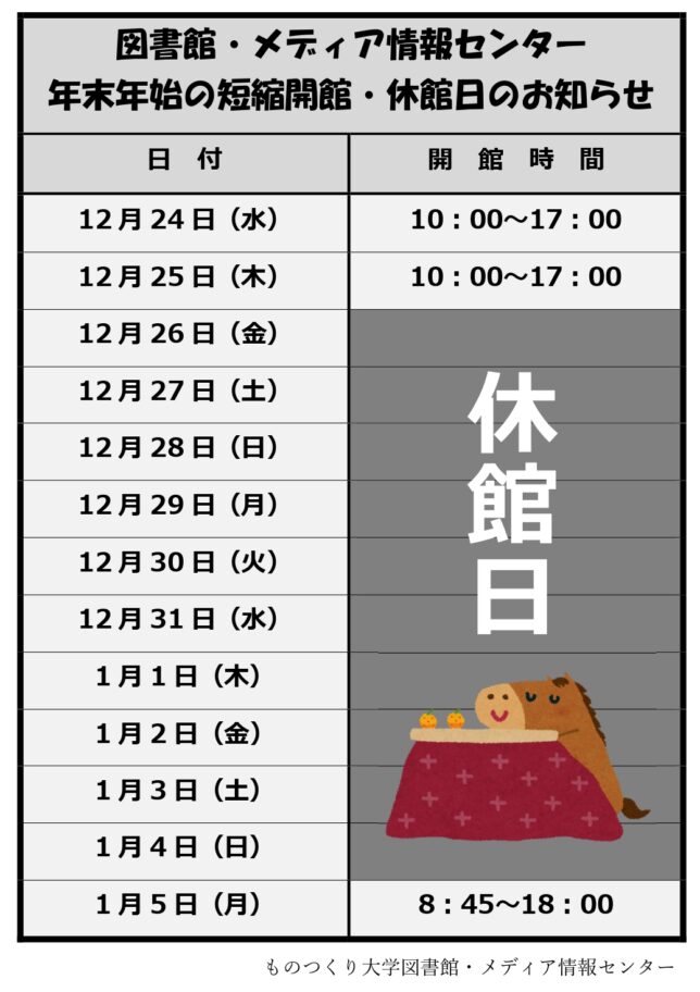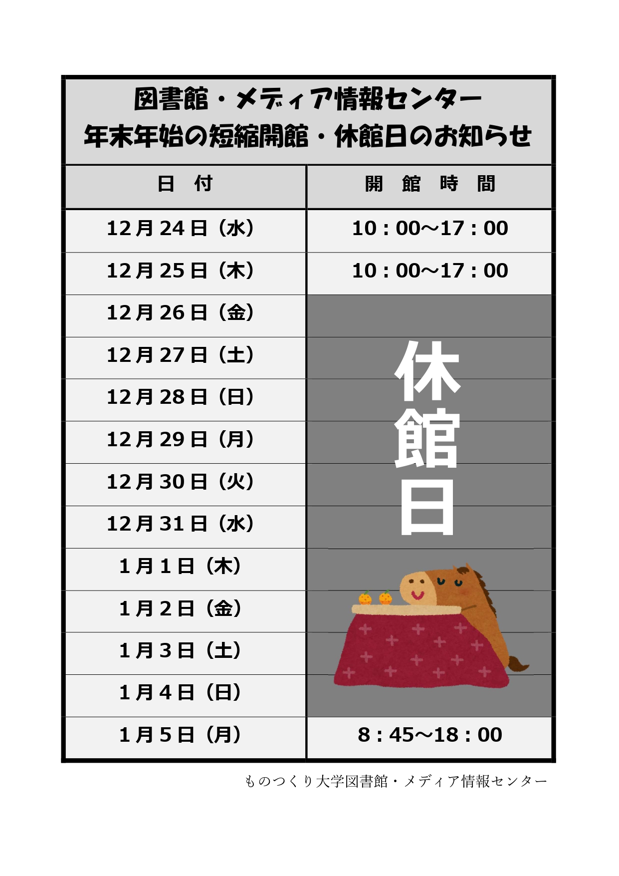 年末年始の開館時間・休館のお知らせ2025/12/02 年末年始の短縮開館及び休館について、以下のとおりとさせていただきます。 短縮開館日 2025年12月24日(水)~2025年12月25日(木) 時間:10:00~17:00 ※土日は通常通り休館日となります。 休館日 2025年12月26日(金)~2026年1月4日(日)年始は、1月5日(月)より通常開館にて開館いたします。