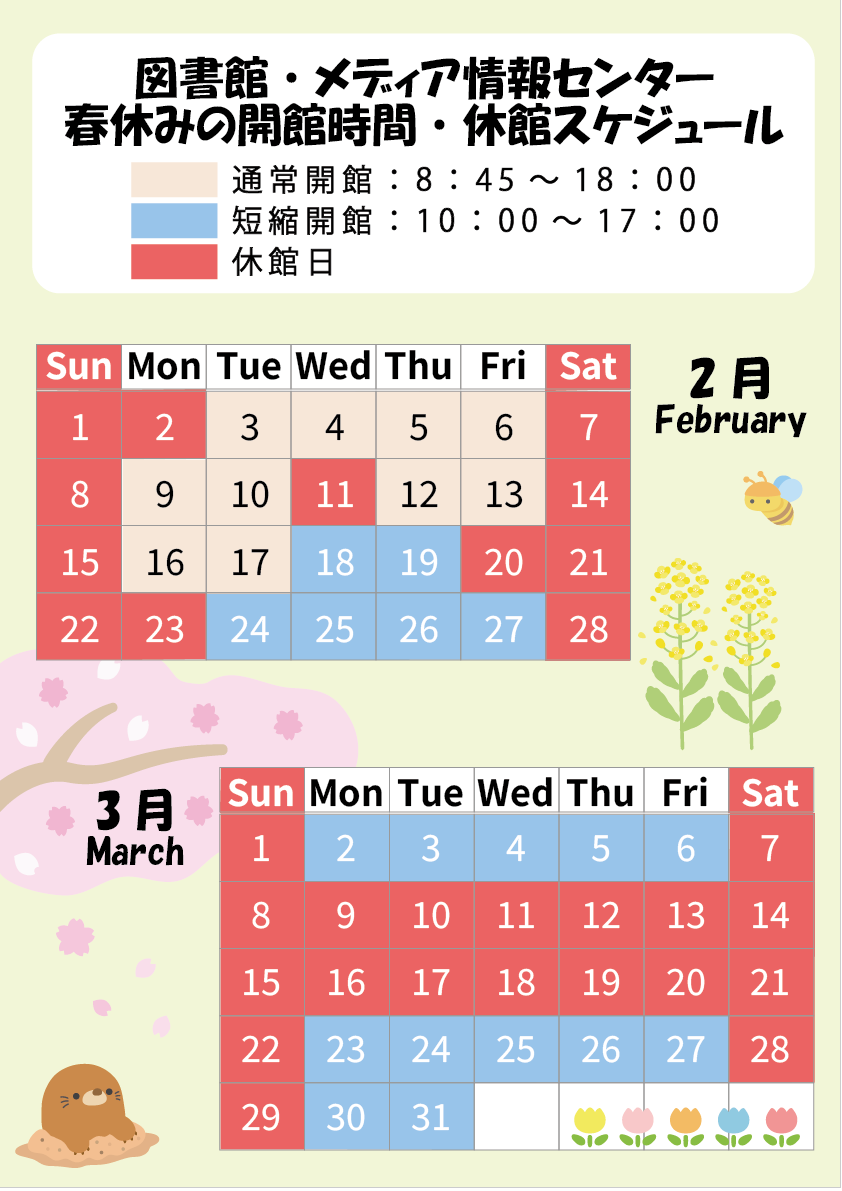 春休みに伴い、以下の日程で休館・短縮開館いたします。