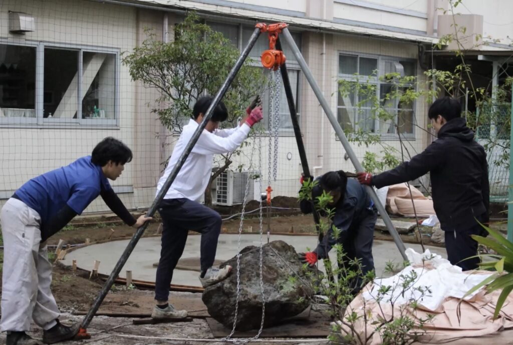そこで工夫したのが、「循環型の資材調達」です。既存の中庭にあった石を再利用し、足りない分は非常勤講師の渡邉先生が経営する「株式会社八廣園」から譲り受けた余剰材などを活用しました。4月の段階で、予算計算と綿密な工程計画を詰め、徹底的に準備しました。