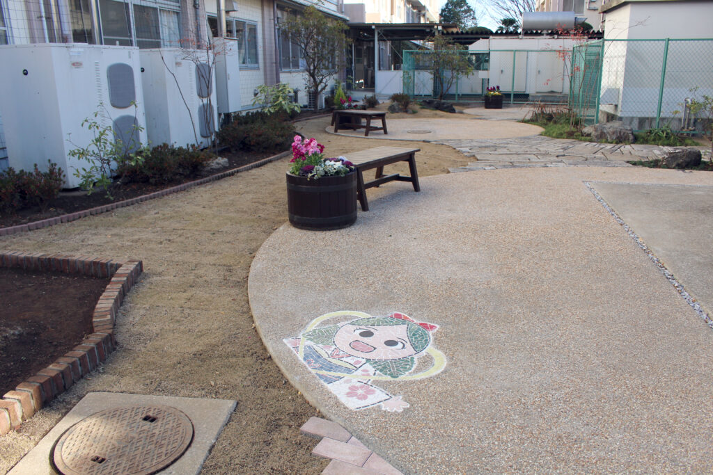 そして、もう一つは「タイルアート」です。通常の造園ではあまり行わない手法ですが、岩槻商業のマスコットキャラクターである「商子(しょうこ)ちゃん」をタイルで描くことにしました。