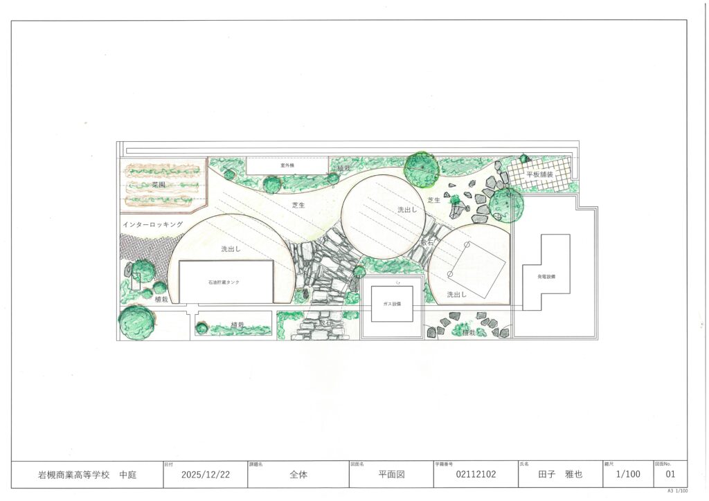 手描きで2案作成しました。1枚描くのに1時間半くらいかけました。平面的なポイント。つまり庭のメインになる場所を決め、それと同時にそのメインを引き立てる「空き」、つまり空間の余裕を大切にしたいと考えました。植栽や石の「高さ」のバランスを重視して構成をもしたんです。そこから高校側と打ち合わせを重ね、2案それぞれの良さを残しながらブラッシュアップしていきました。