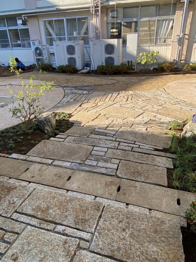 施工期間は大学での準備を含めると100日を超え、岩槻商業の現場には約80日通い詰めました。工程としては、まず地盤を整えてコンクリートを打ち、洗い出しの仕上げを施してから石畳を組んでいく。骨格となる「固い物(石や構造物)」ができてから、最後に樹木を入れ、芝を張って「柔らかさ」を出す。これが造園のセオリーです。