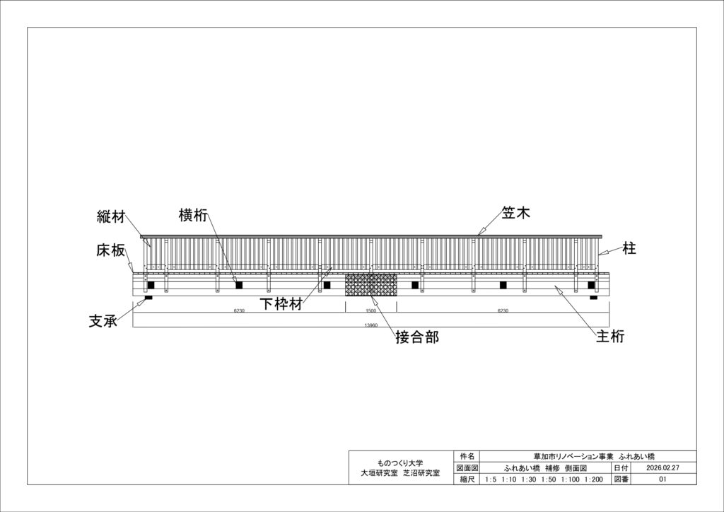 2024年5月、ものつくり大学と草加市が締結した「木橋リノベーション事業に関する基本協定」。その第2弾として2025年度に取り組んだのが、橋長14メートルの木橋「ふれあい橋」の再生です。橋梁・構造を研究する建設学科の大垣研究室と、木造構造・材料を研究する芝沼研究室による共同リノベーション事業として実施されました。この事業の中心を担った、建設学科4年生の小林駿斗さん(大垣研)と坂本匠さん(芝沼研)に、実践的な学びや苦闘、そして成長の記録をインタビューしました。