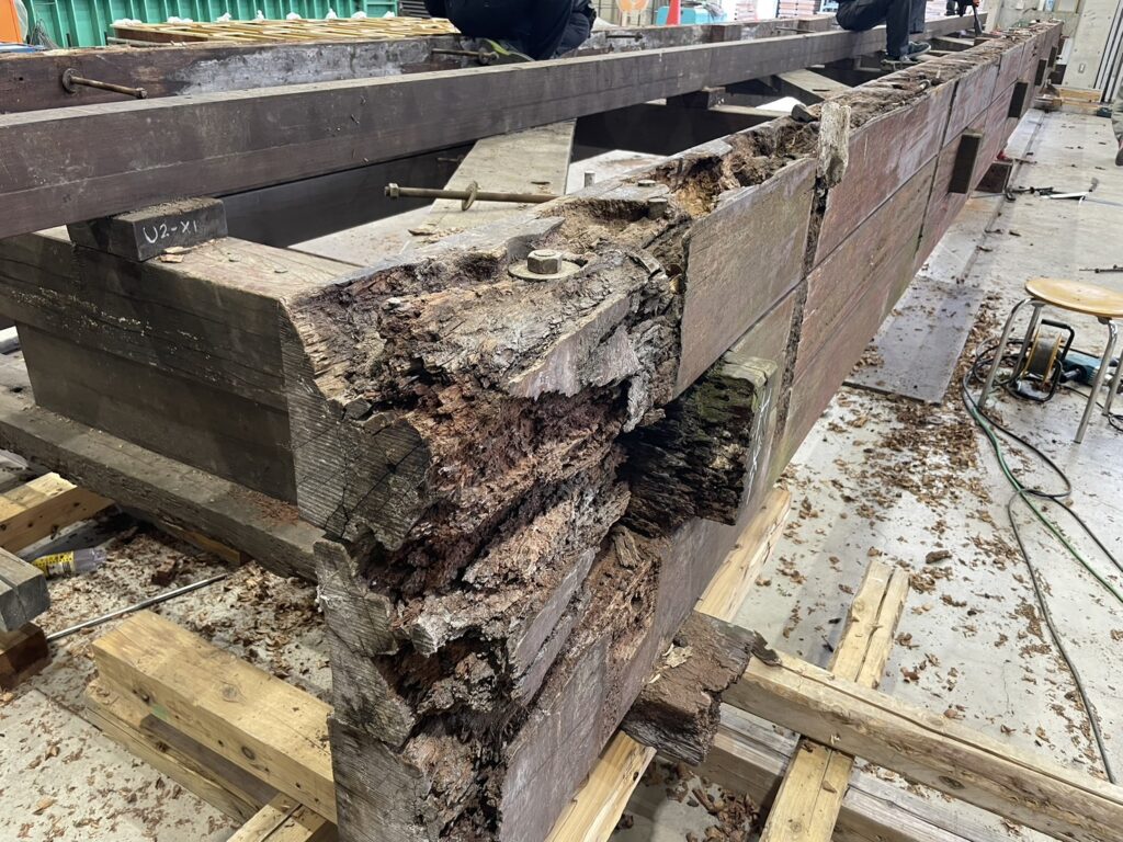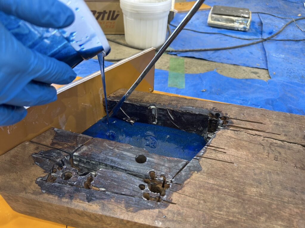 苦労したのは「樹脂」の温度管理でした。解体後に腐った部分を取り除き、そこに樹脂を流し込んで固める作業をしたんです。樹脂を漏らさないために木材の欠損部に合わせ枠を貼って、樹脂を流し込む型枠を作りました。樹脂は混ぜると化学反応で熱を持ちますが、夏の猛暑もあって、型枠の中でグツグツと煮え立ってしまうんですよ。それを防ぐため、早朝から少しずつ注入し、つきっきりで作業しました。型枠を外して整えるまで計3日。日付をまたぐこともありましたが、木材を確実に蘇らせるためには欠かせない工程でした。