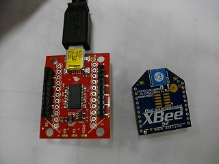ヨーヨー内部に組み込む無線モジュール。右がXBeeシリーズ2で左がPCにつないでファームフェア等の設定をするためのXBeeエクスプローラーです。