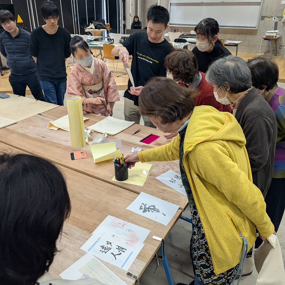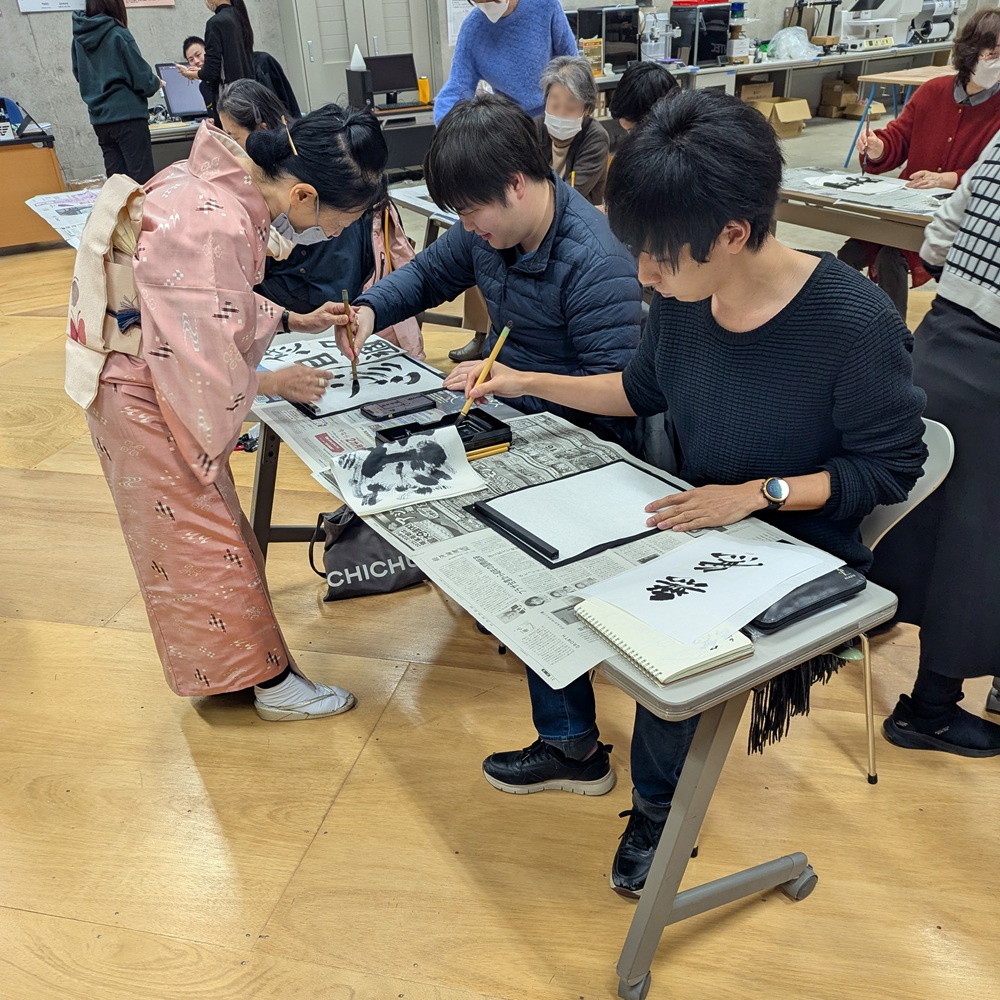 本イベントは、書道教室あしび会・橋本志水先生を講師にお迎えし、筆で書いた文字をデータ化し、トートバッグへの転写や木製プレートへ加工する、書道とデジタルものづくりを融合した体験教室です。