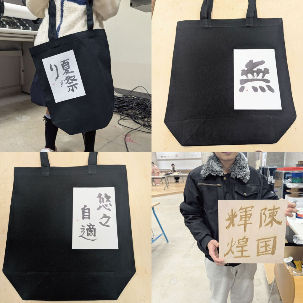 完成した書はデータ化され、溶剤インクジェットプリンターやレーザー加工機を使用して、世界に一つだけのオリジナル作品へと生まれ変わりました。