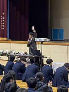 2025年12月17日(水)、情報メカトロニクス学科細合晋太郎講師が、埼玉県立北本高等学校全校生徒約330人を対象に「未来を創るロボットと人間の共創~ドラえもんのつくりかた~」をテーマにDX講座を実施しました。本講座は同校のDXハイスクール事業の一環として行われたもので、代表生徒によるロボット体験を含めて約60分の講義をしました。