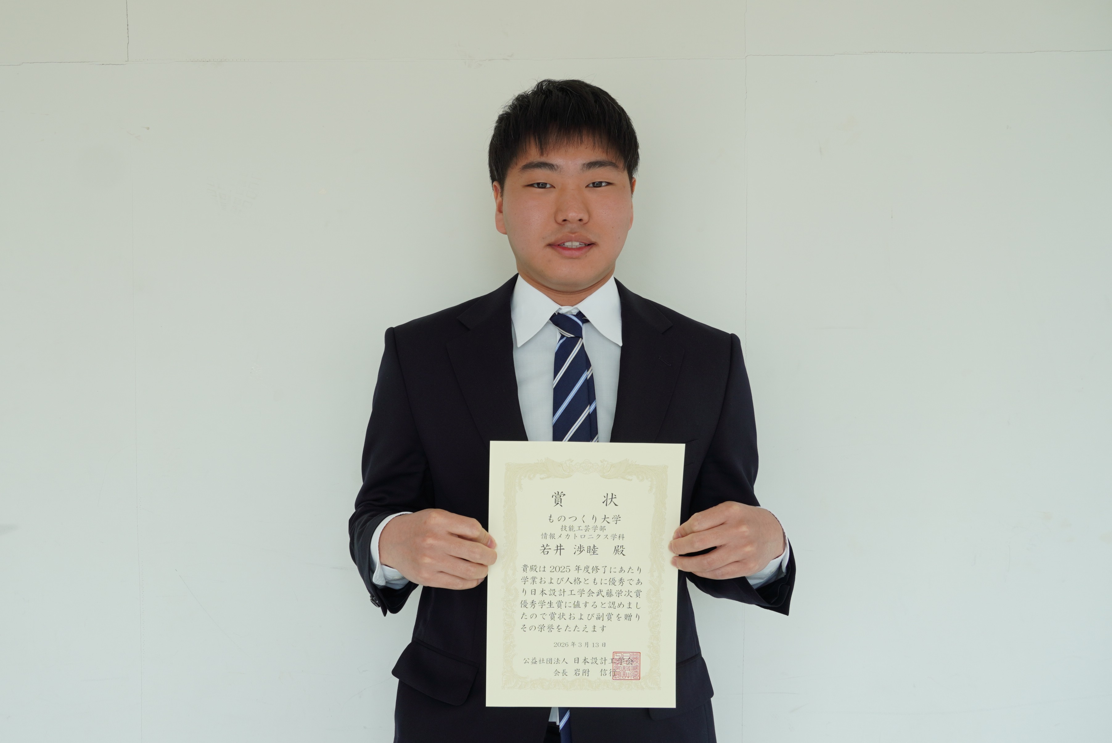 また、情報メカトロニクス学科4年の若井渉睦さん(町田研究室)が、日本設計工学会武藤栄次賞を受賞しました。