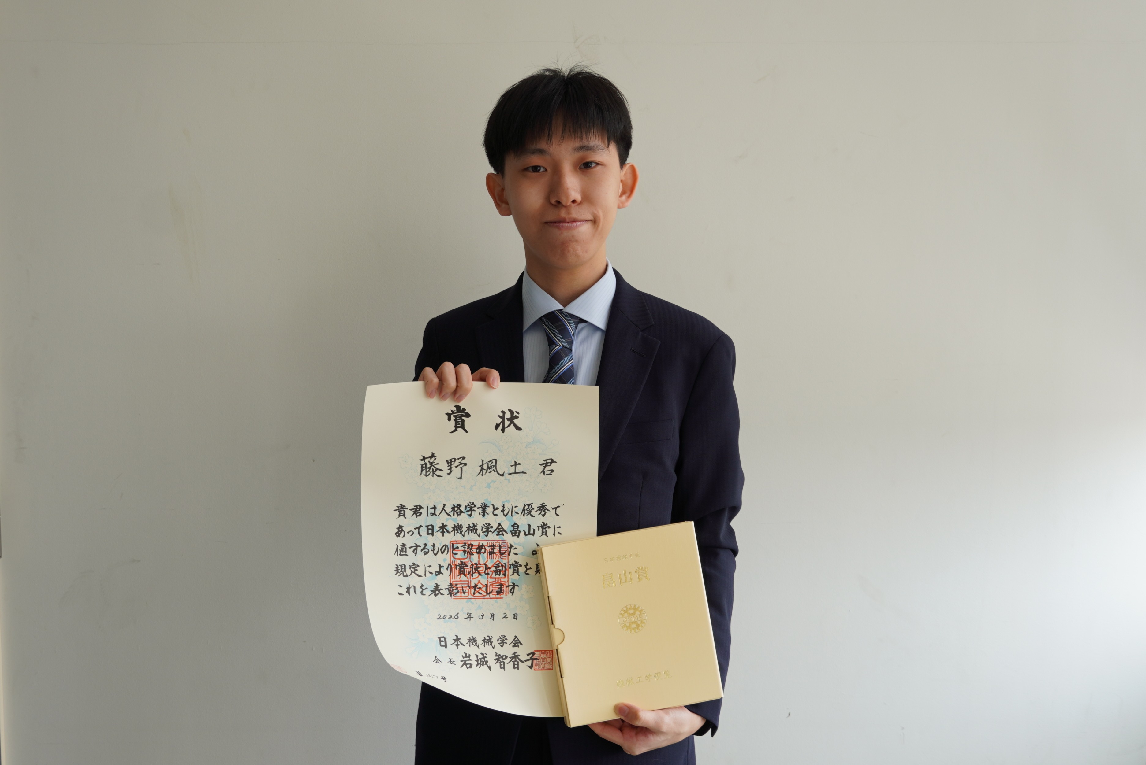 情報メカトロニクス学科4年の藤野楓土さん(三井研究室)が、日本機械学会畠山賞を受賞しました。
