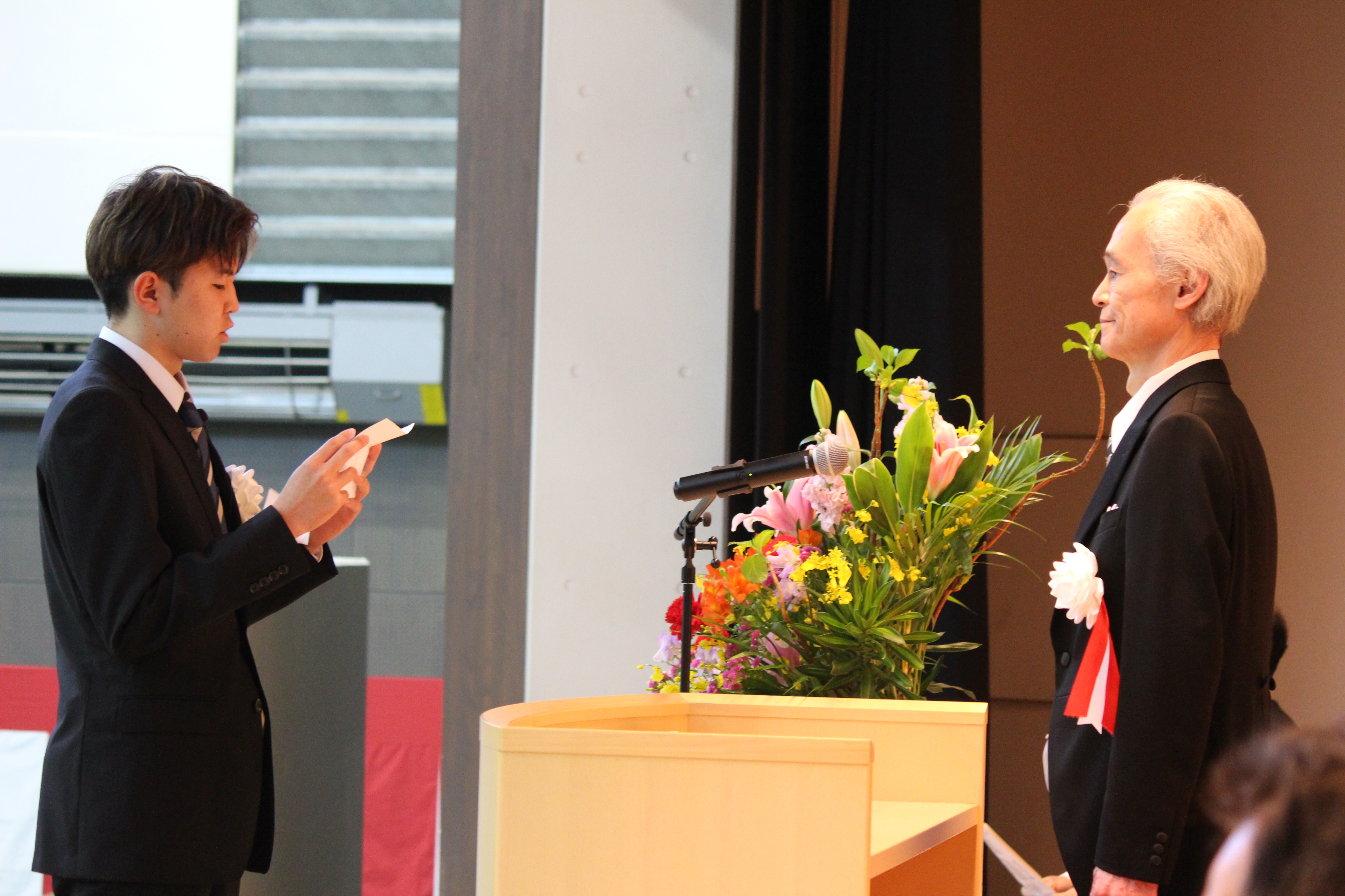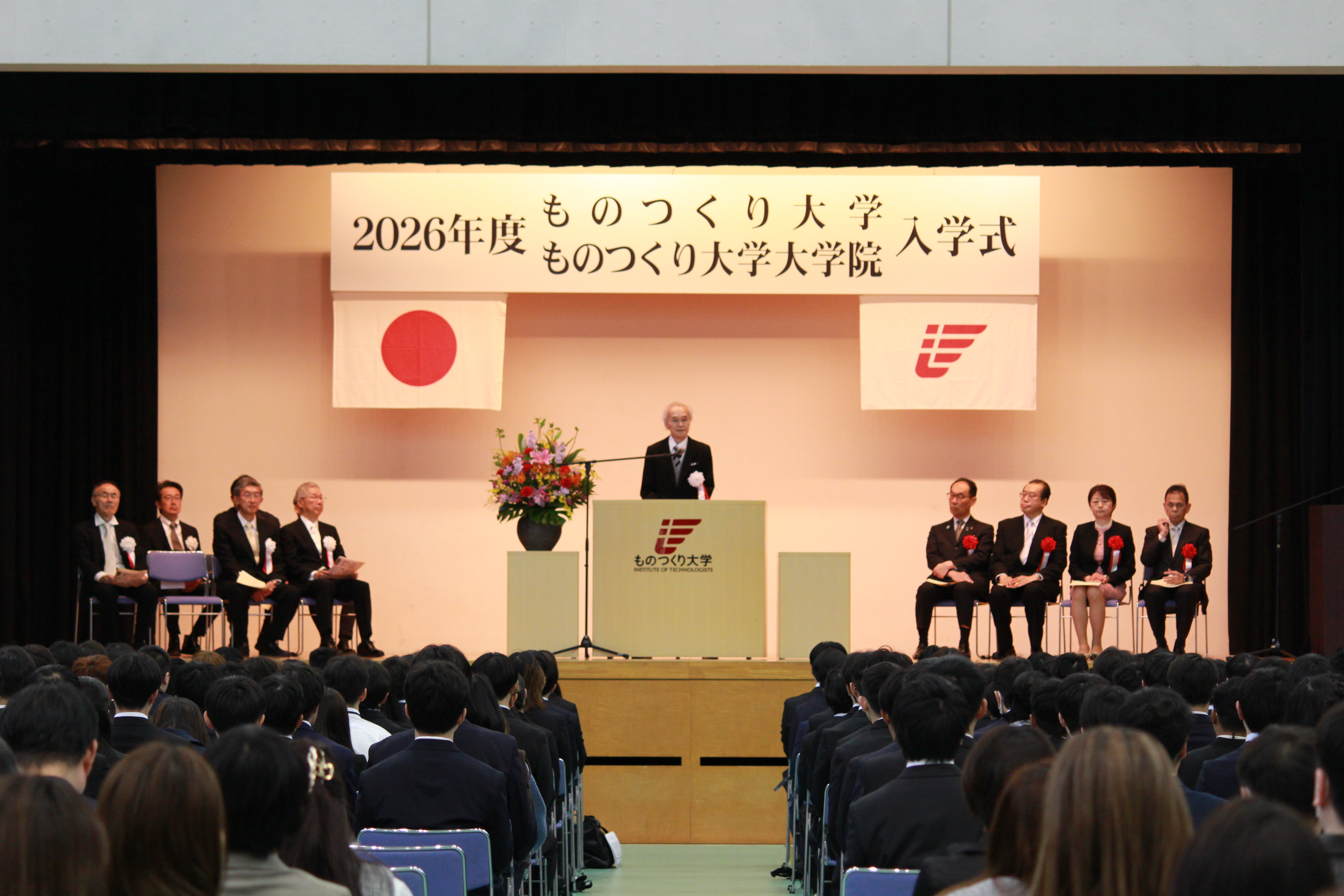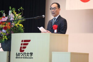 式典では、佐藤勲学長、正井健太郎会長から新入生へお祝いの言葉が贈られました。来賓には、大野元裕埼玉県知事、片淵仁文埼玉労働局長、行田邦子行田市長、橋元建埼玉県経営者協会会長にご臨席賜り、ご祝辞を頂戴しました。また、新入生代表からは誓いの言葉が述べられました。