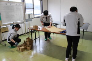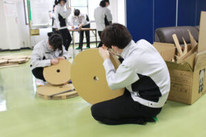 4月7日、本学フレッシュマンゼミで実施している、チームビルディングの醸成などを目的とした取り組みが、 株式会社アイエムアイ(群馬県富岡市)にて行われました。同社では、新入社員6名を対象に、ダンボールカート2台の製作において、準備から製作作業、走行会までの全工程を5日間で完了する特別プログラムとして実施されました。当初は緊張したおもむきの社員達も、製作が進むにつれて表情に変化が見られ、中盤以降は意欲的に取り組む様子がうかがえました。また、走行会では、自ら製作したダンボールカートの走行を見守る姿が印象的でした。