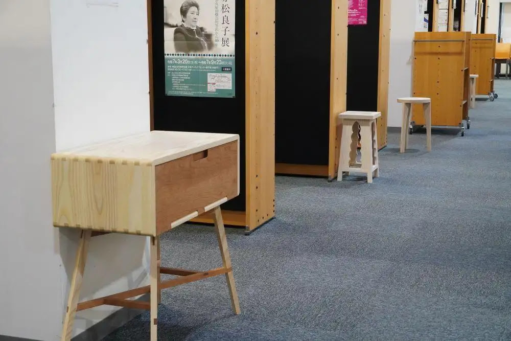 海外の青少年が参加し、3月21日~27日にかけて本学を会場に開催された「world wood day」のプログラム「国際青少年木工交流キャンプ」で、参加者と本学の学生が製作した家具の一部が、本部棟1階の図書館・情報メディアセンター内に展示されています。