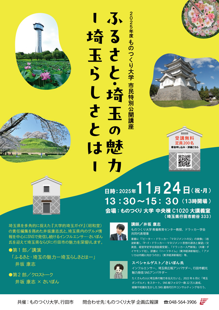 11月24日(祝・月)、2025年度 市民特別公開講座「ふるさと・埼玉の魅力 ー埼玉らしさとはー」を開催します。