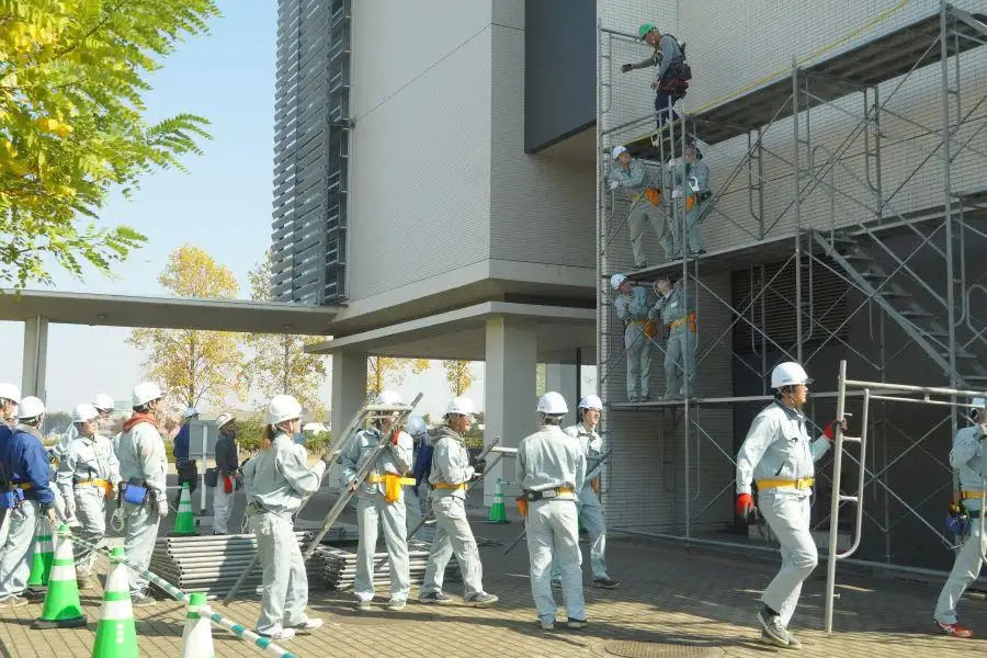 今年も実習場を飛び出して、キャンパスを現場に見立てて行う建設学科の「超・実習」が始まりました。建設学科の3年生たちが連携プレーで足場を組んでいきます。昨年に続き、大学本部の外壁タイルを補修していきます。