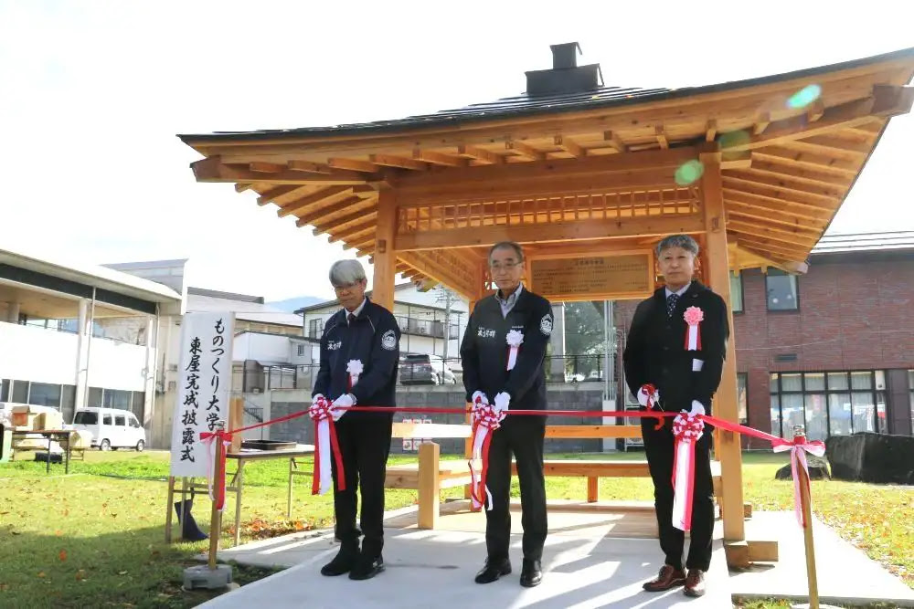 また、10月25日の村民祭の際に行われた東屋の完成披露式には、本学から地域連携推進・渉外室長の田尻要教授が出席しました。
