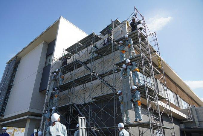 今年も実習場を飛び出して、キャンパスを現場に見立てて行う建設学科の「超・実習」が始まりました。建設学科の3年生たちが連携プレーで足場を組んでいきます。昨年に続き、大学本部の外壁タイルを補修していきます。