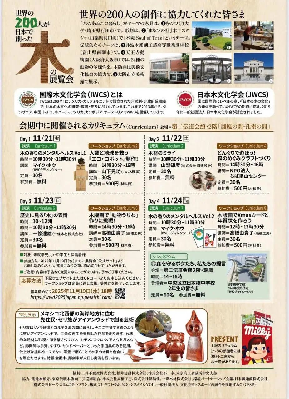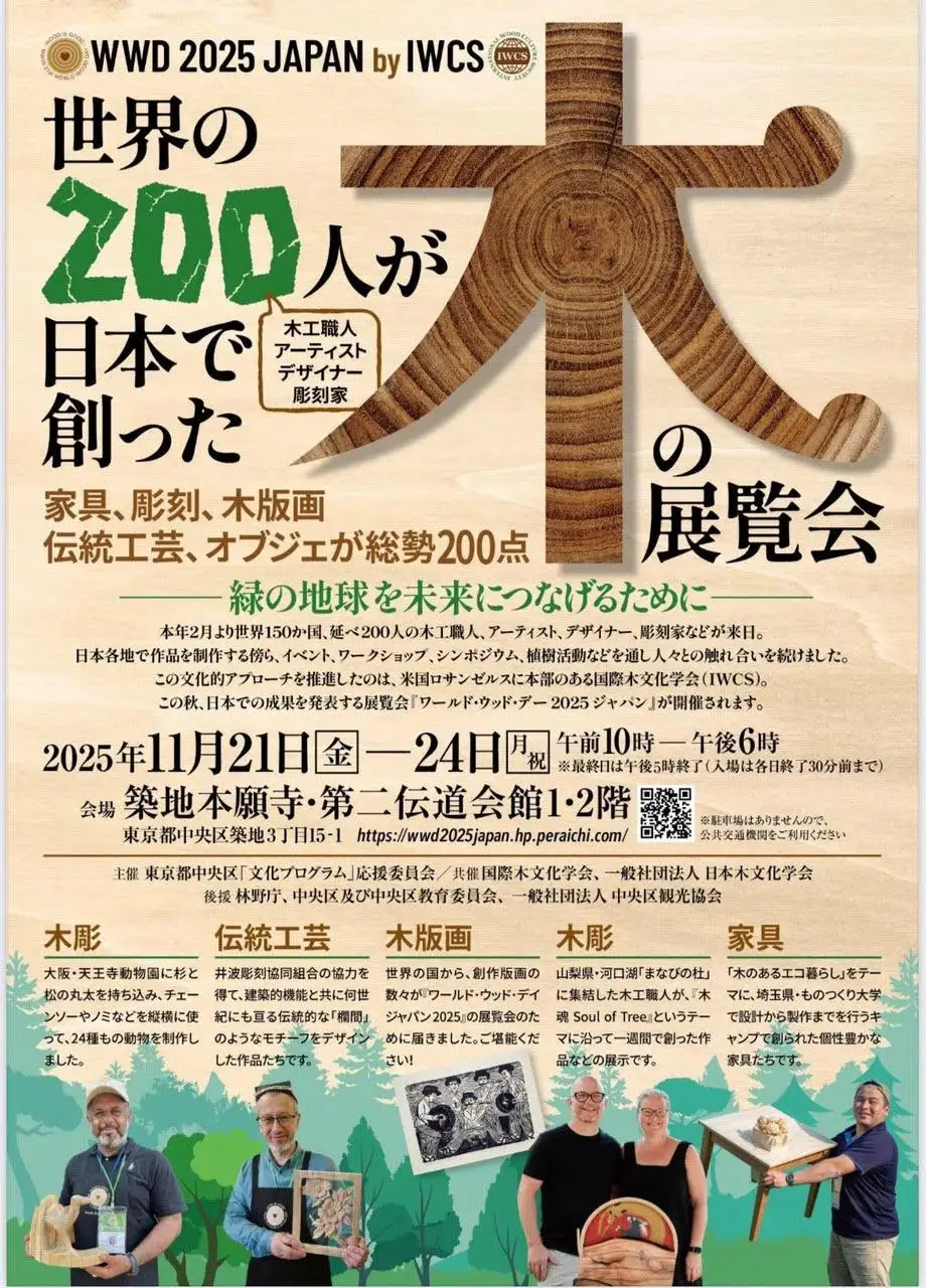 『ワールド・ウッド・デー2025ジャパン(WWD2025JAPAN)』は、世界の木文化の研究、教育、普及に取り組んでいる米国に本部のある、国際木文化学会(IWCS)が推進している取り組みで、世界150か国、延べ200人の木工職人、アーティスト、デザイナー、彫刻家などが来日し、日本各地の自然を通じた文化交流・制作活動の成果を発表する展覧会です。