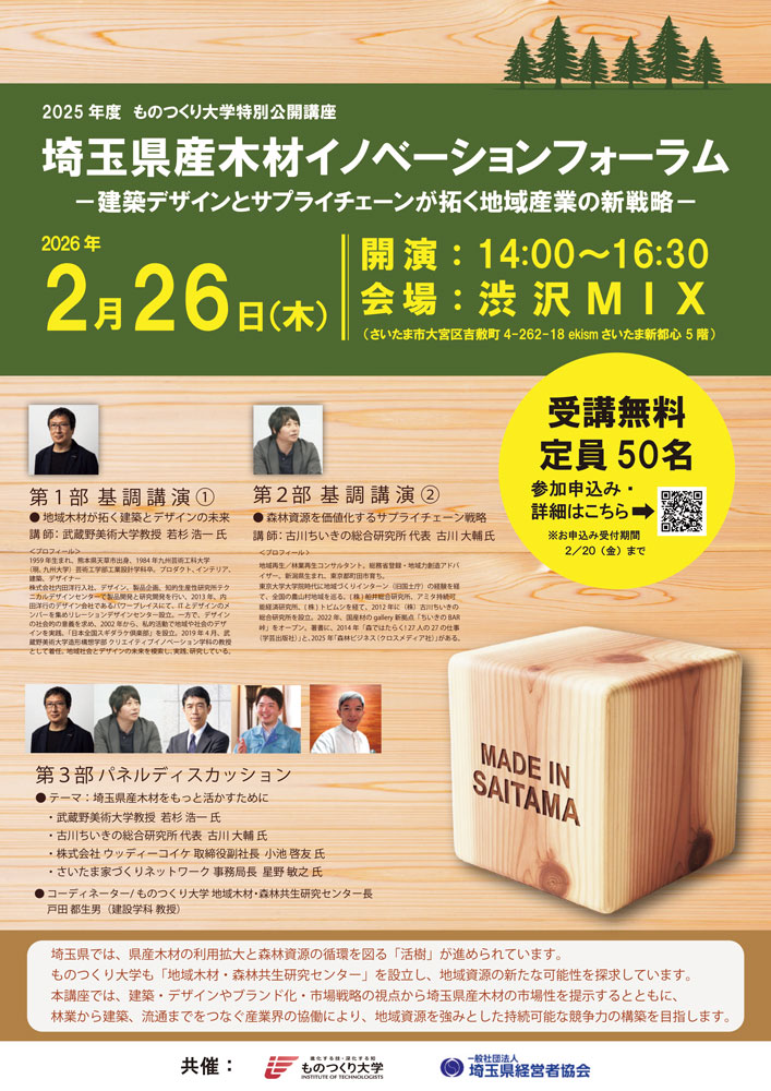 NEW【2025年度ものつくり大学特別公開講座「埼玉県産木材イノベーションフォーラム ―建築デザインとサプライチェーンが拓く地域産業の新戦略―」を開催します】