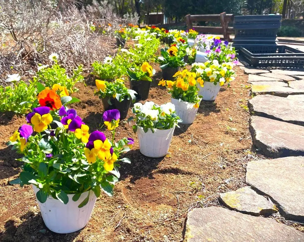 ポットのままの苗が、これから土に根を張る準備をしています。