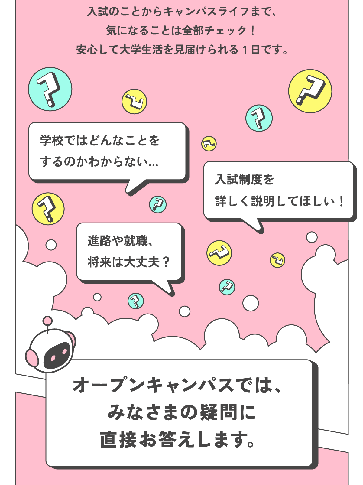 自分に合った入試方法は?受験勉強の仕方は?もっと詳しく大学を知りたい!など気になる質問になんでも答えます!