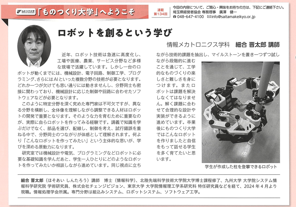 埼玉県経営者協会のご協力の下、同協会の会報誌「埼玉経協ニュース」に本学の研究紹介のコーナー「ものつくり大学へようこそ」が掲載されております。過去1年間の記事を紹介しておりますので、ぜひご覧ください。